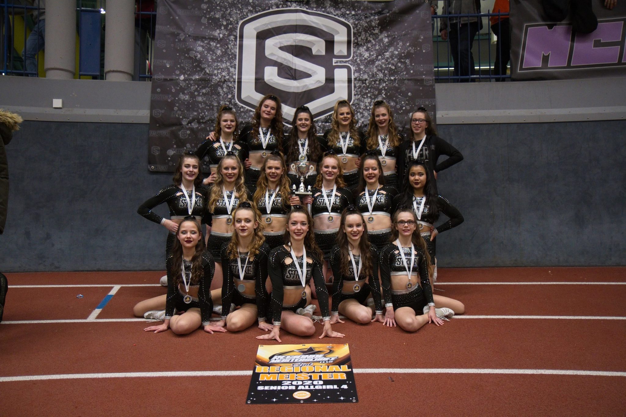 Auch Storm (Mädchen ab 13 Jahren) zeigte einen tollen Auftritt im Senior Allgirl Level 3. Obwohl sich kleine Fehler eingeschlichen haben, ließen sich die vierzehn Mädchen nicht aus der Ruhe bringen und zeigten eine bis zum Ende souveräne Routine. Da Storm als einziges Team in dieser Kategorie an den Start gegangen ist, stand eine saubere Präsentation im Vordergrund. Spannend wurde es bei der Siegerehrung trotzdem, denn das Ziel, die Qualifikation zur Regionalmeisterschaft, war an eine Punktzahl von 5 Punkten gebunden. Mit 6,84 Punkten konnten Storm sich diese sichern.